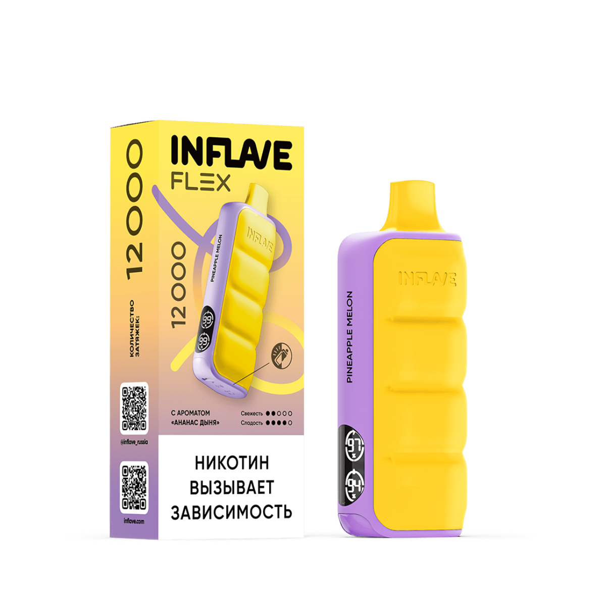 Электронная сигарета INFLAVE FLEX 12000 “Ананас, Дыня” – идеальный выбор для тех, кто предпочитает освежающие фруктовые вкусы и современные технологичные устройства. Приобретайте в Snusbar – надежном магазине электронных сигарет!